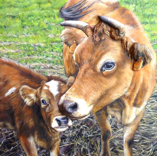 Peinture "Portrait de Vache et Veau à la Ferme en
